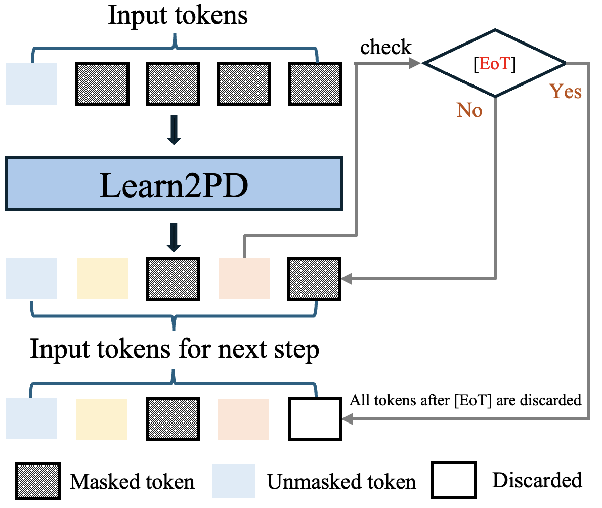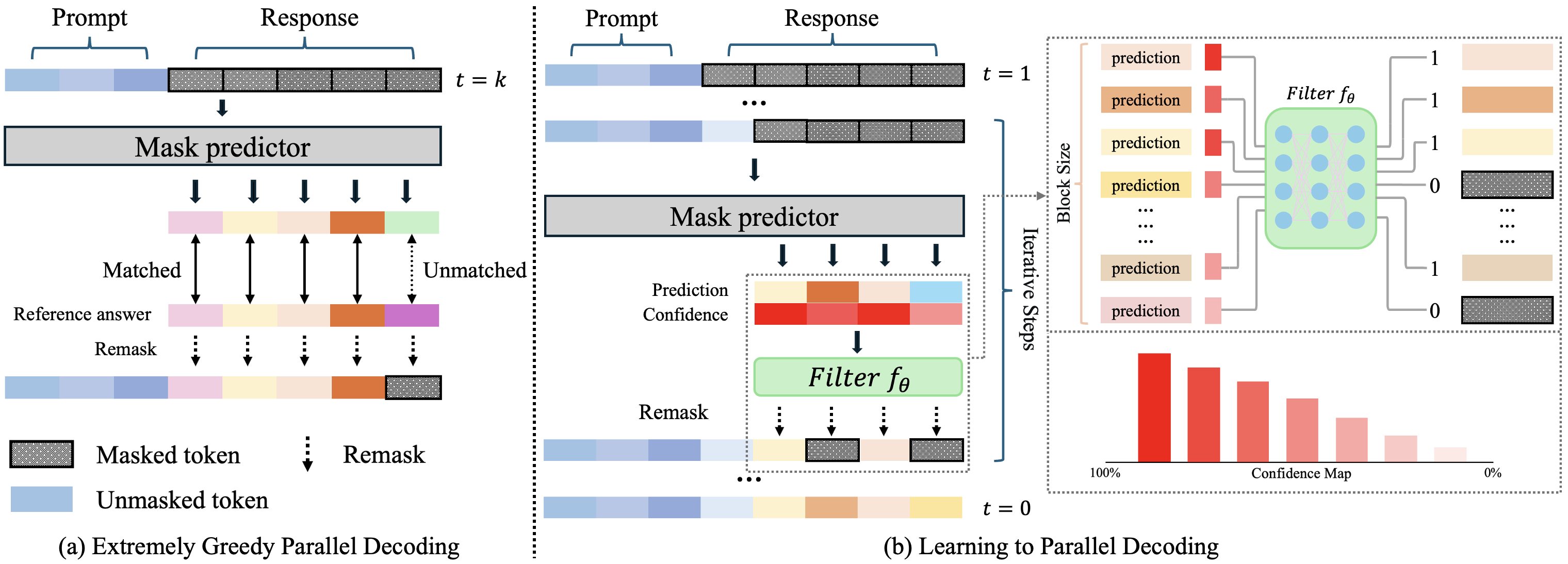 Use a trained \(Filter f_\theta\) that simulate the Extremely Greedy Parallel strategy after each decoding step to select tokens and decide whether to remask them.