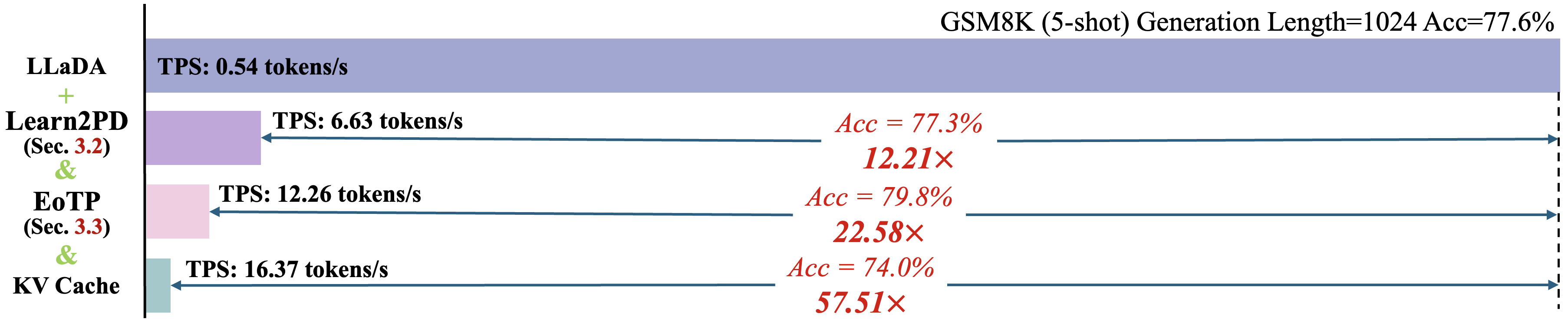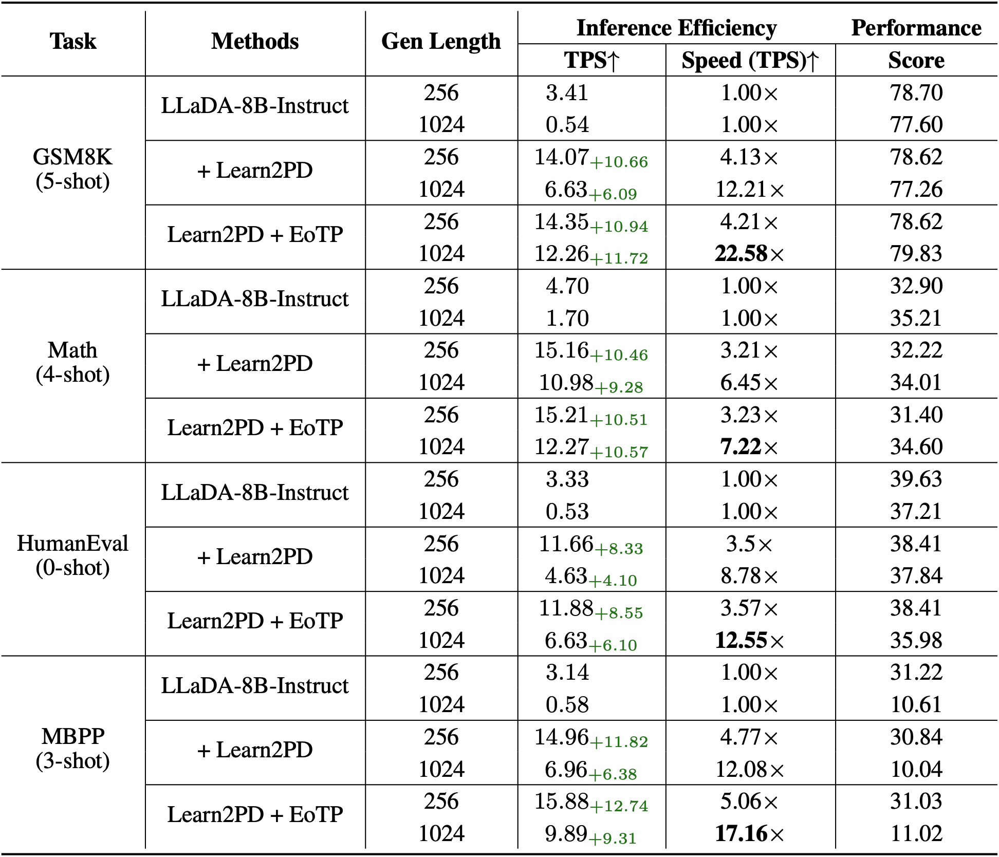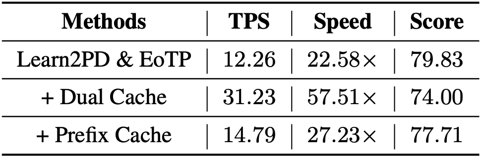 We further evaluate the compatibility of our approach with established Key-Value (KV) Cache techniques by integrating both Dual Cache and Prefix Cache strategies. Experiments are conducted on GSM8K with a generation length of 1024 tokens. As summarized in the following table, the baseline model (Learn2PD & EoTP) achieves a throughput of 12.26 TPS, a speed-up of 22.58×, and an accuracy score of 79.83. When augmented with the Dual Cache, the system attains substantially higher efficiency, reaching 31.23 TPS and a 57.51× speedup, albeit with a slight decrease in accuracy (74.00). Similarly, incorporating the Prefix Cache also brings noticeable improvements, yielding 14.79 TPS and a 27.23× acceleration while maintaining a competitive score of 77.71. These results confirm that our method is orthogonal to and fully compatible with standard KV caching mechanisms, demonstrating its ability to leverage such strategies to enhance inference efficiency.